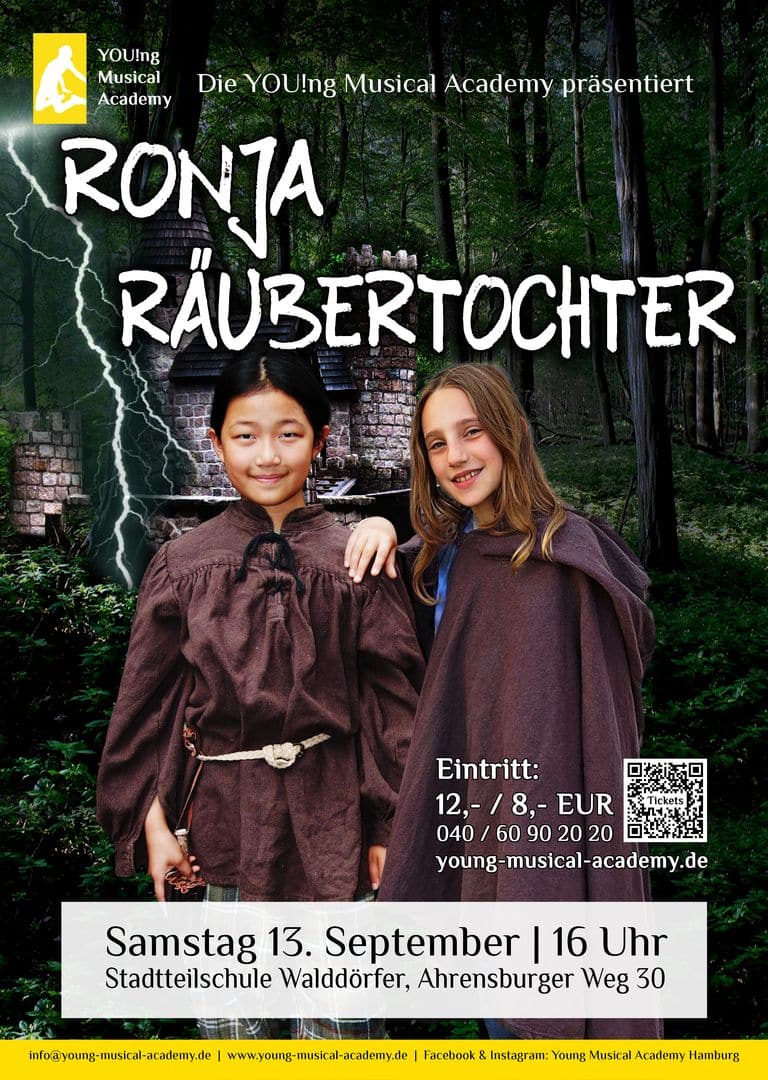 Mitten im Wald, zwischen Räubern, Graugnomen und Wilddruden, wächst Ronja, die Tochter des Räuberhauptmanns Mattis, auf. Eines Tages trifft sie auf ihren Streifzügen Birk, den Räubersohn aus der verfeindeten Sippe von Borka. Und als die Eltern den beiden verbieten, Freunde zu sein, fliehen Ronja und Birk in die Wälder … „Die wilde Romantik, die Kraft des Ursprünglichen dieser Geschichte steckt an.“(Süddeutsche Zeitung)